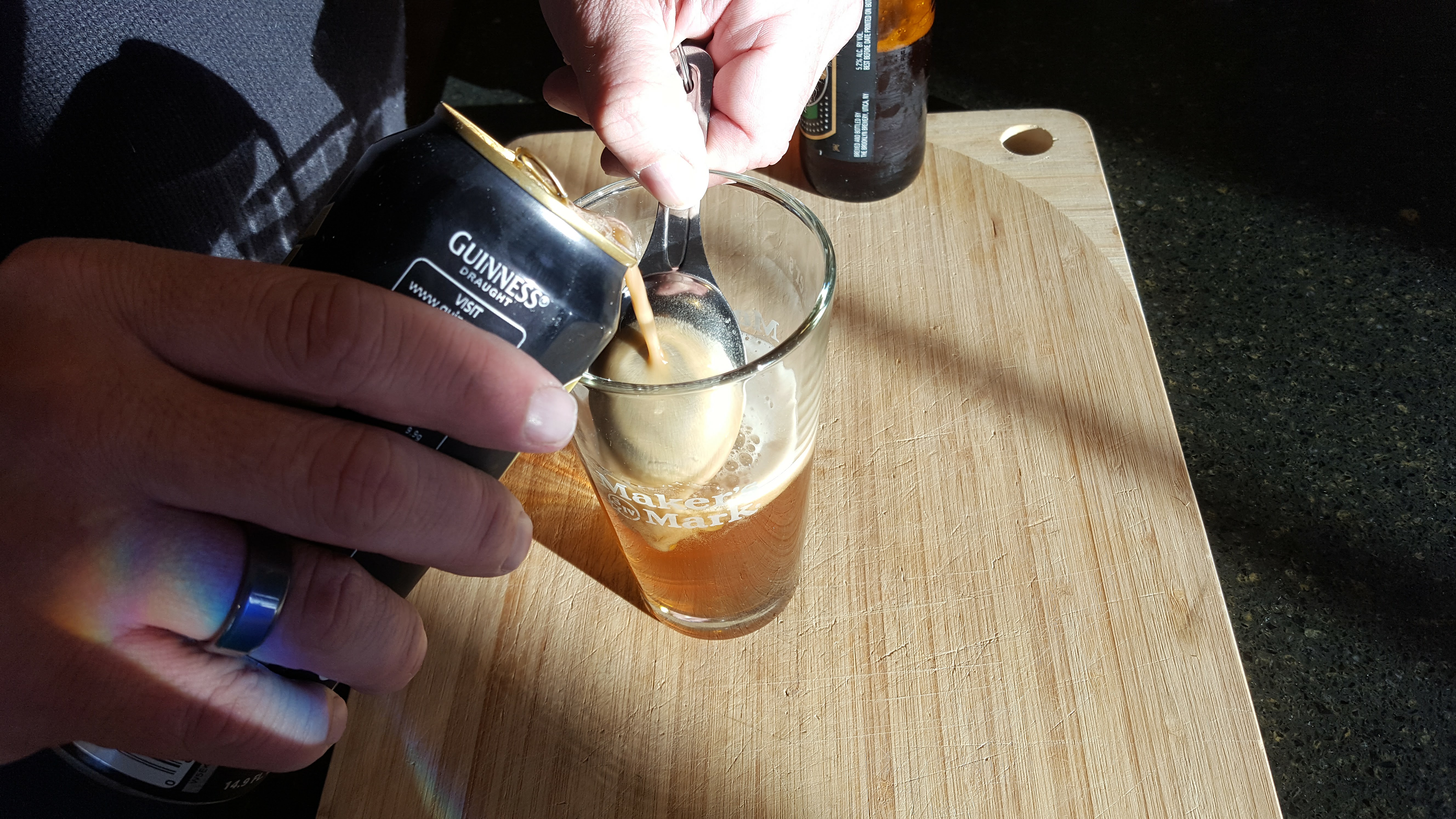 Place the spoon curved side up on and angle into the glass, so the lower lip of the spoon is just in the head of the lager. Pour your Guinness very slowly on the back of the spoon so it runs into the glass instead of pours in. Move the spoon up the glass as you pour