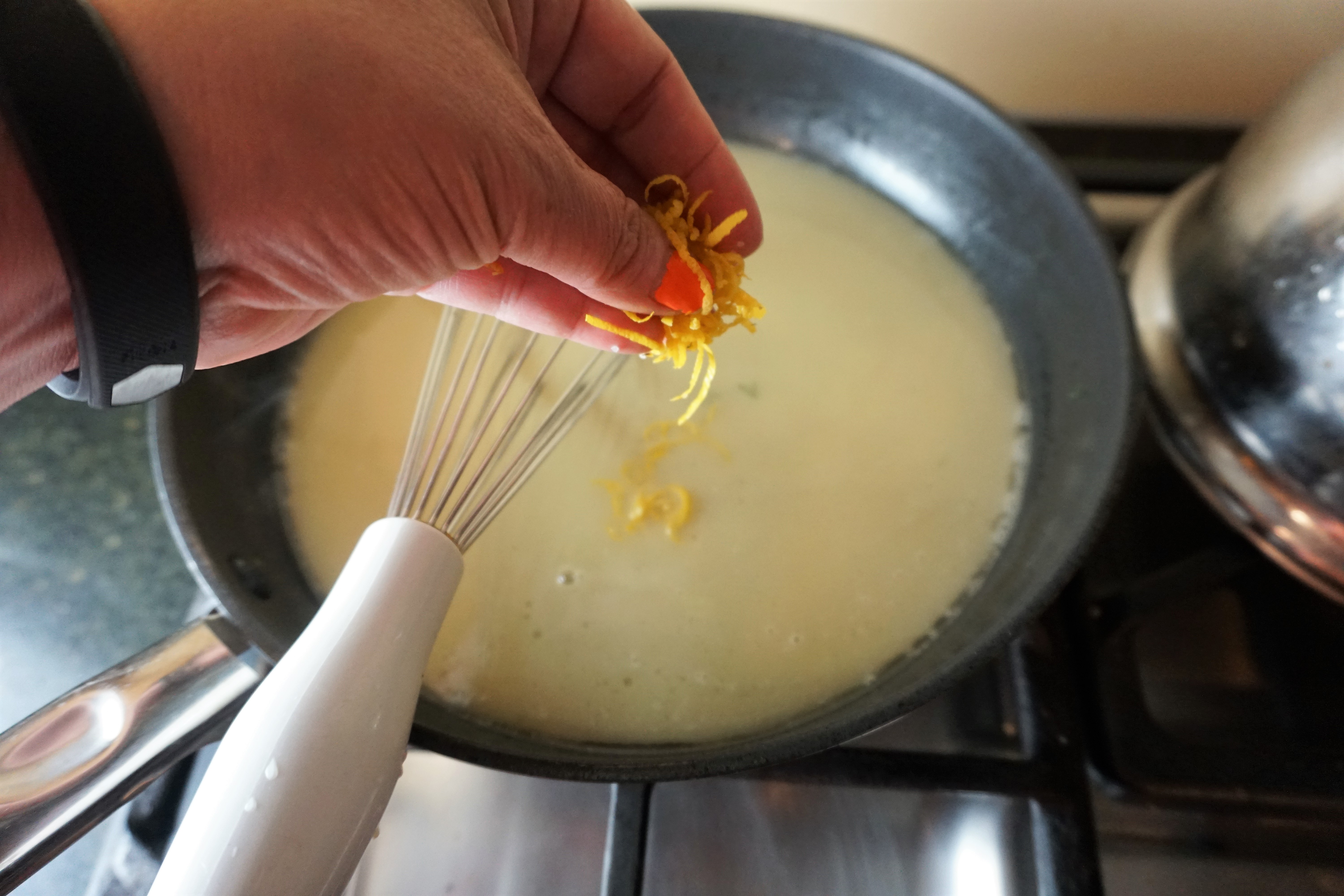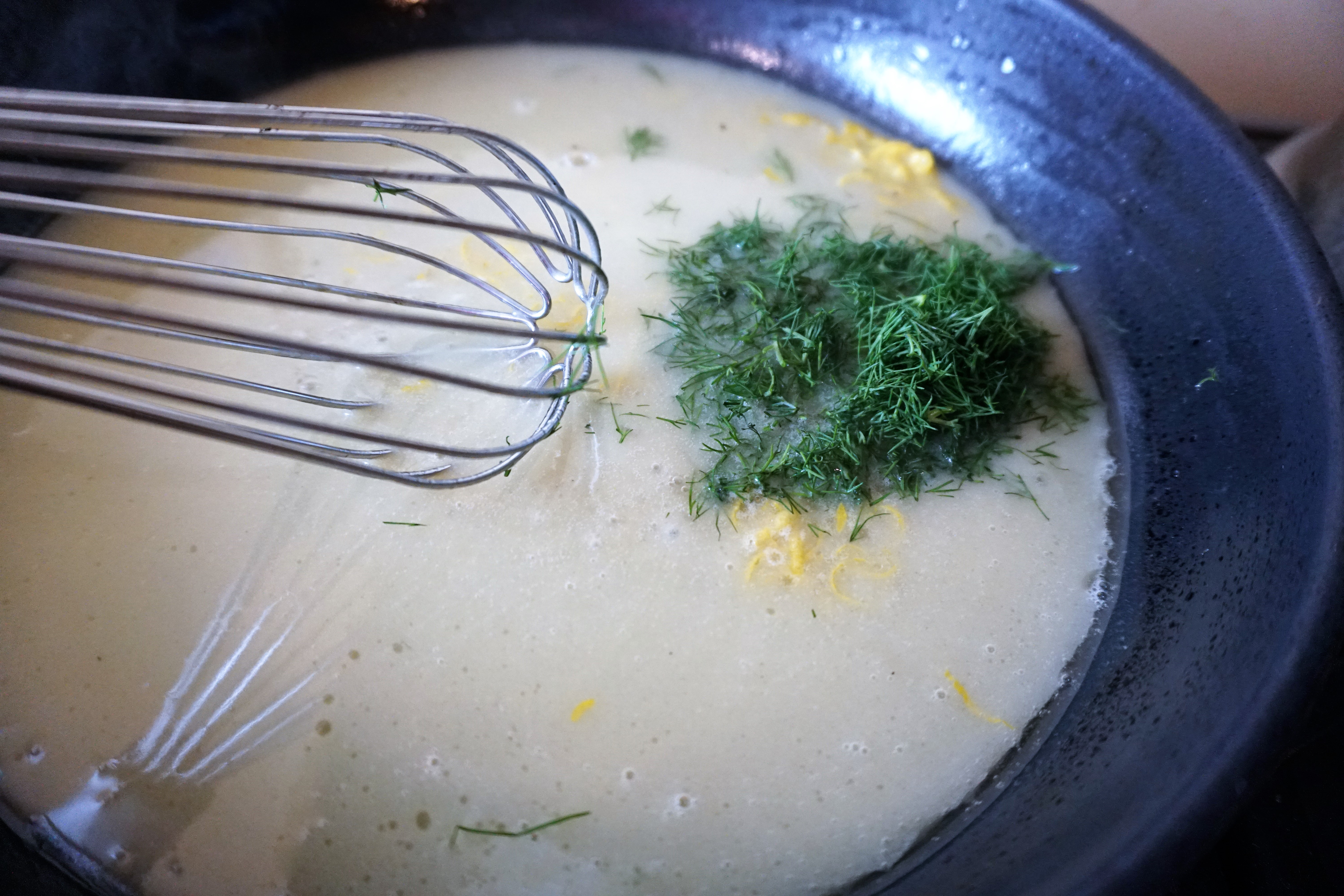 Zest and juice the lemon, finely chop the fresh dill; place the pan back over medium heat and add in the lemon juice, zest, and fresh dill