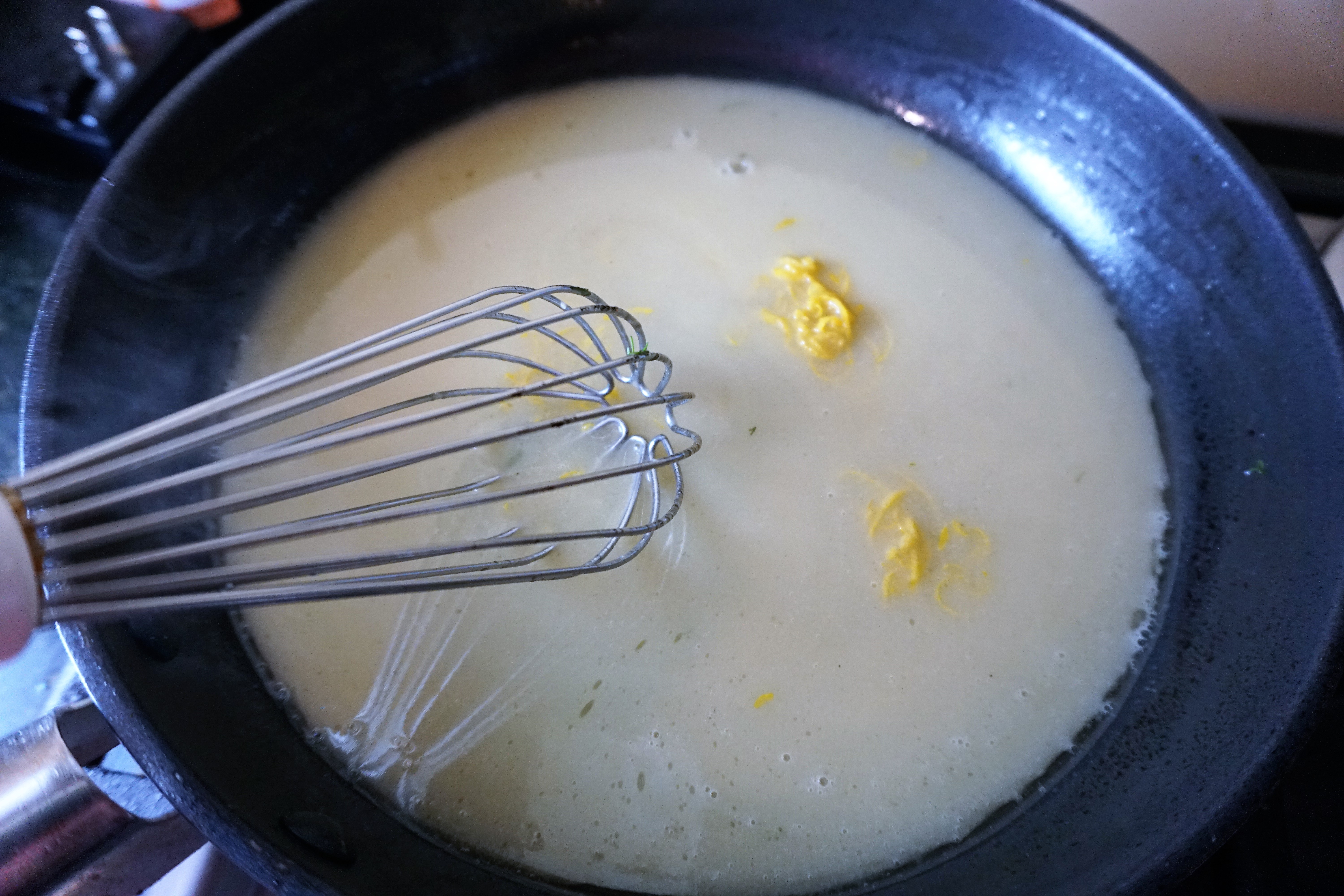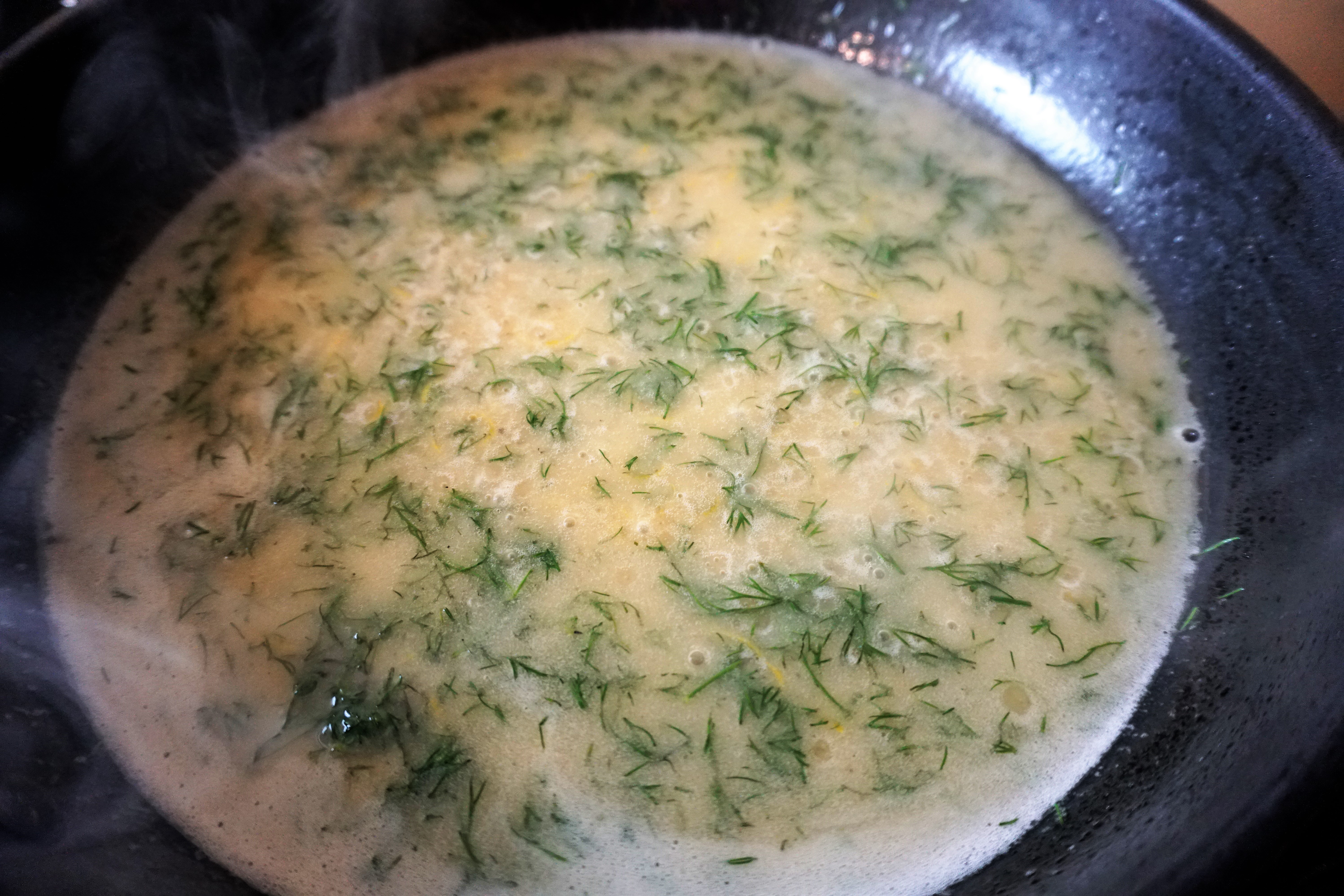 You’ll need 1 1/2 cups of a good quality white wine, (remember what we always say… if you won’t drink it, don’t cook with it!) 1 cup of chilled butter, 6 tablespoons of fresh dill, the zest and juice of one lemon and kosher salt & black pepper for seasoning