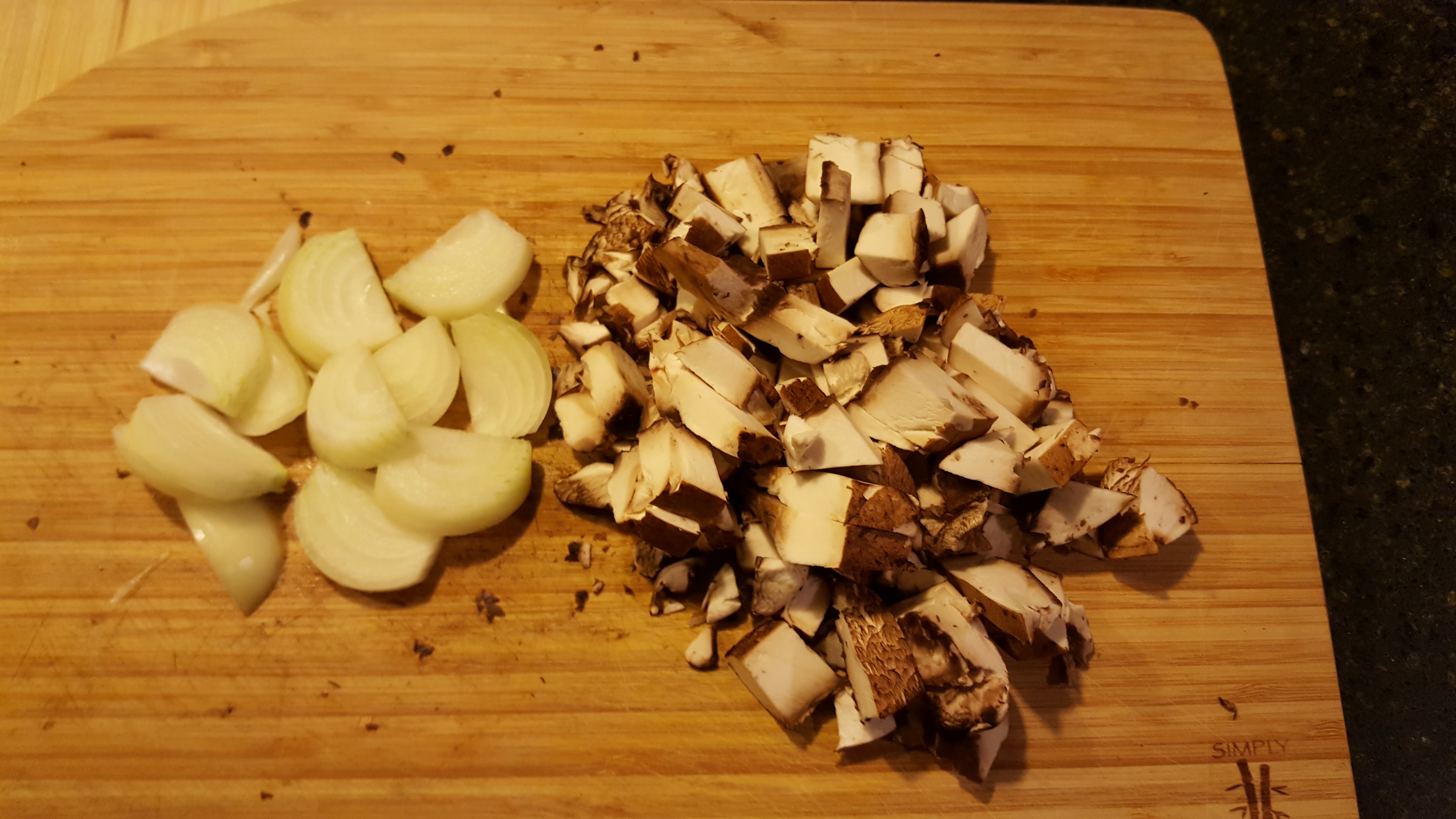 Remove the stems and gills from 2 portabella mushrooms and give them a chop. Peel and chop 1 onion. Heat 2 tablespoons of extra virgin olive oil over medium heat. Cook the onions and mushrooms for 6-8 minutes, then deglaze the pan with the beef stock and cook another 2-3 minutes