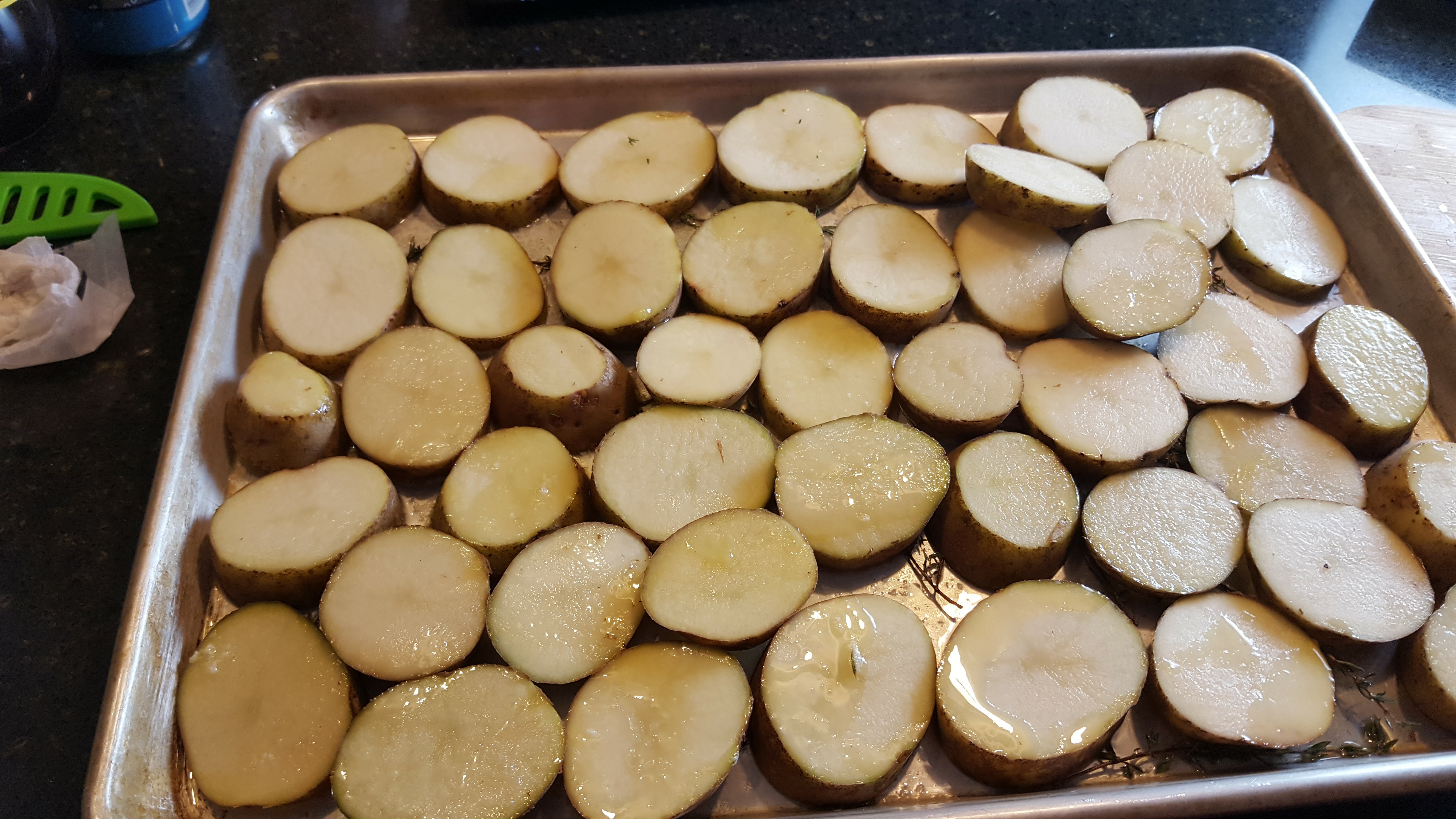 Scrub 3 pounds of Russett potatoes and cut into rounds about a half an inch thick; slice 4 tablespoons of salted butter and place on a sheet pan in the heated oven; once the butter in the pan has melted, add in 8-10 sprigs of fresh thyme