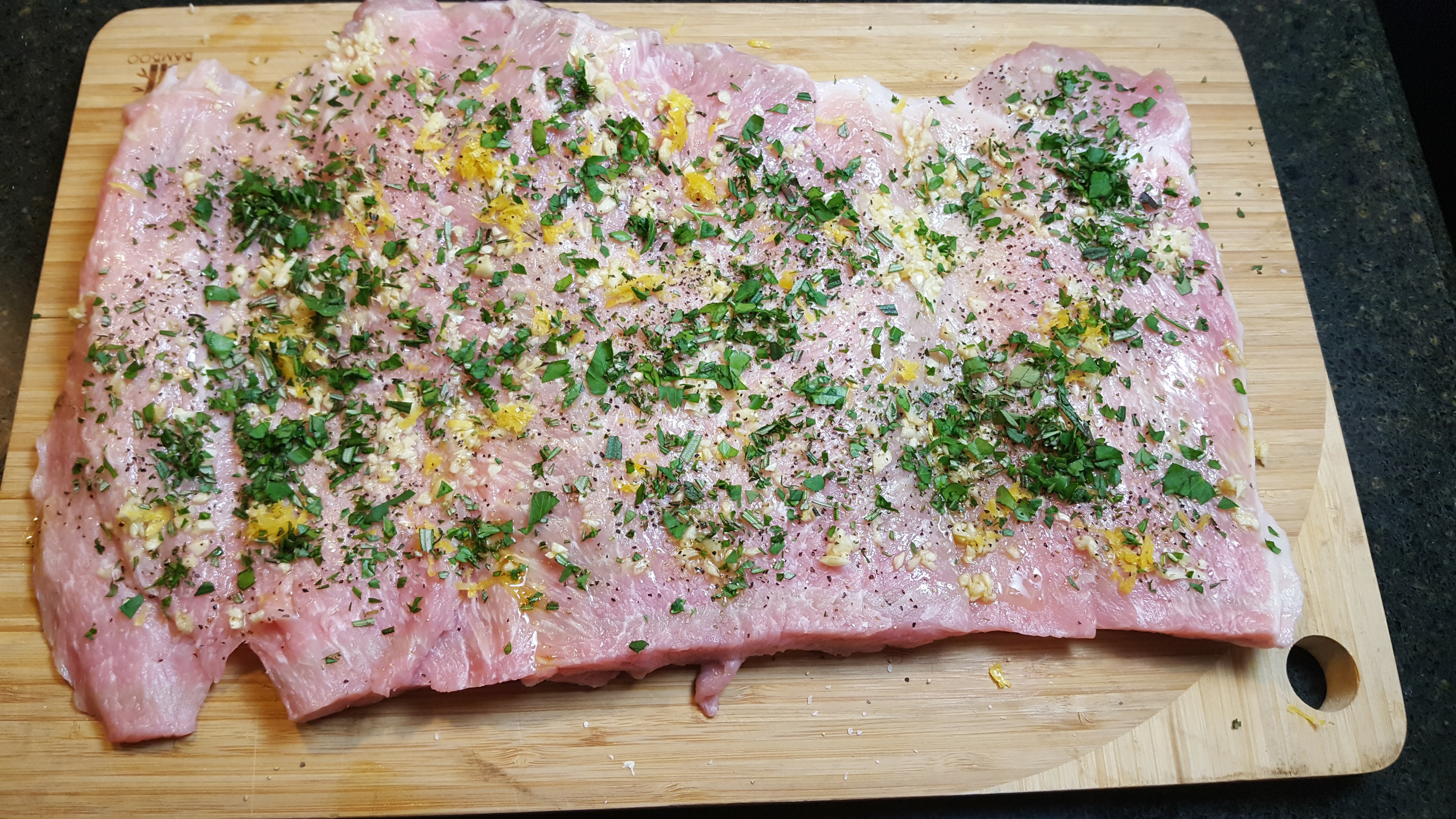 Sprinkle the pork with 1 teaspoon each of kosher salt and ground black pepper along with the zest of 1 lemon. Remove the leaves and discard the stems of 1 tablespoon of rosemary and 1 tablespoon of oregano. Place them in a pile and add 1 tablespoon each of sage, parsley and chives. Give everyone a fine chop and then sprinkle over the pork