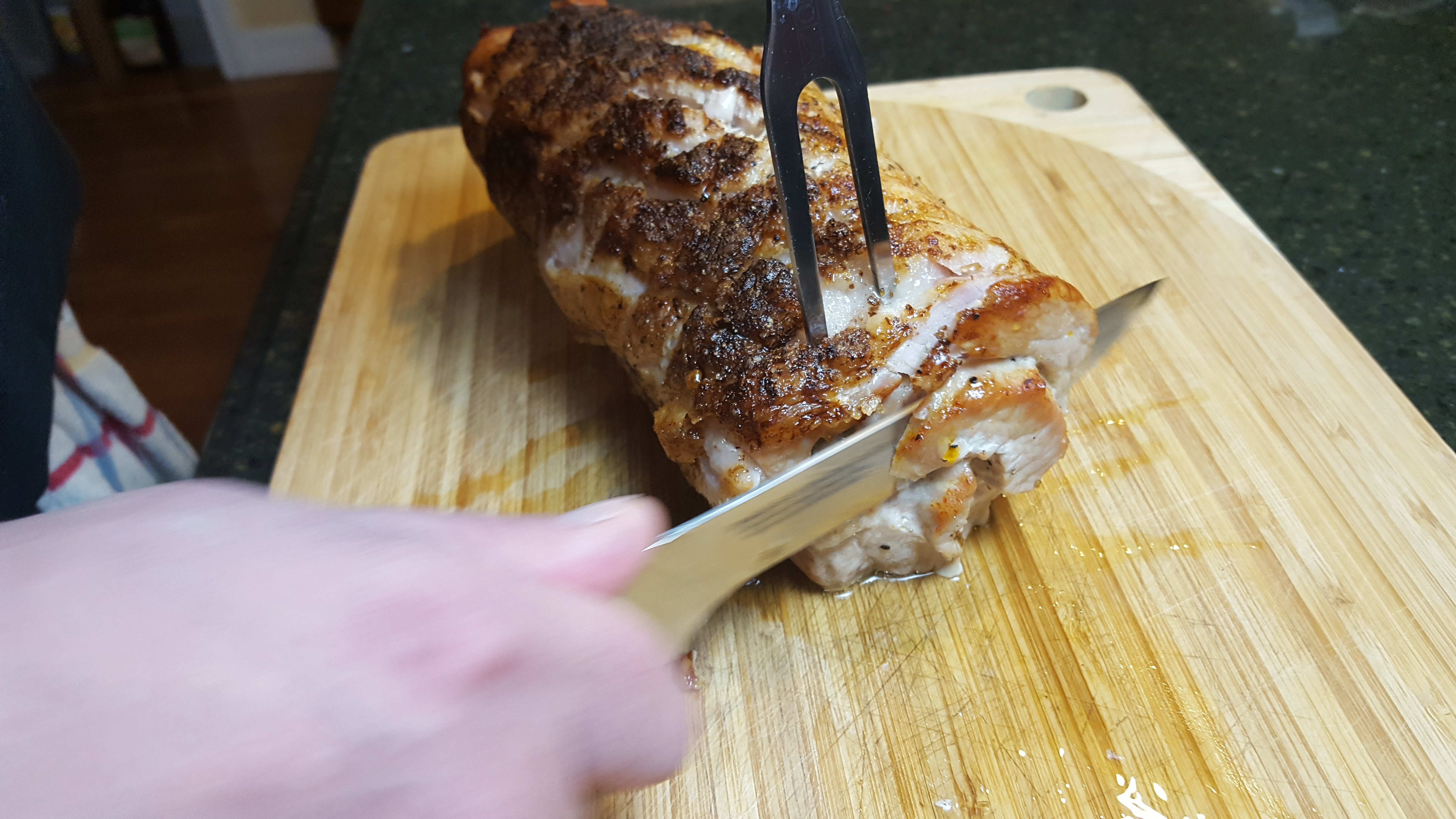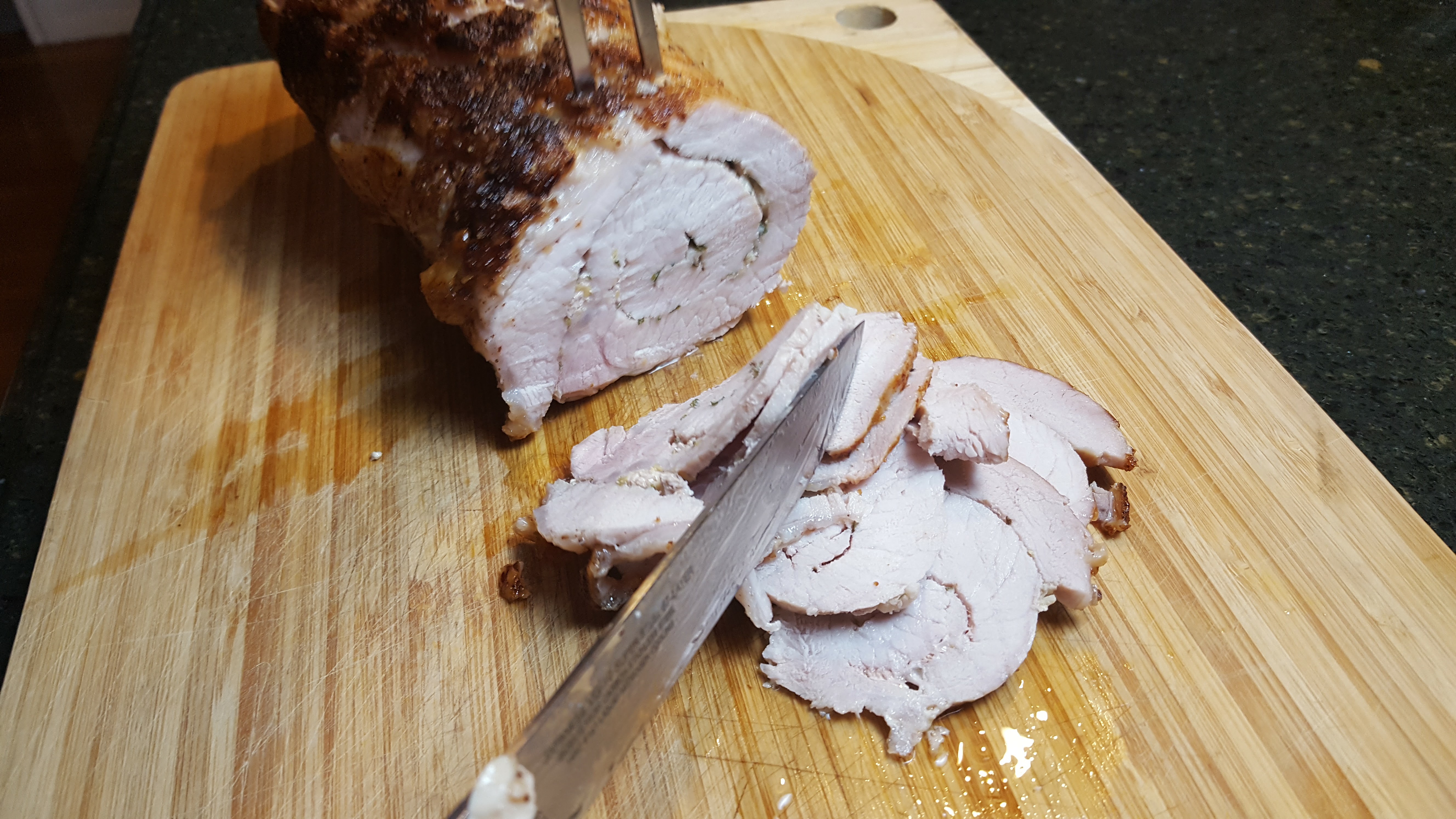 Place into an oven preheated to 350 F and roast for around 1 hour or until a thermometer inserted into the thickest part of the roast registers 145 F. Remove from the oven and place on a cutting board. Allow the roast to rest at least 10 minutes before slicing