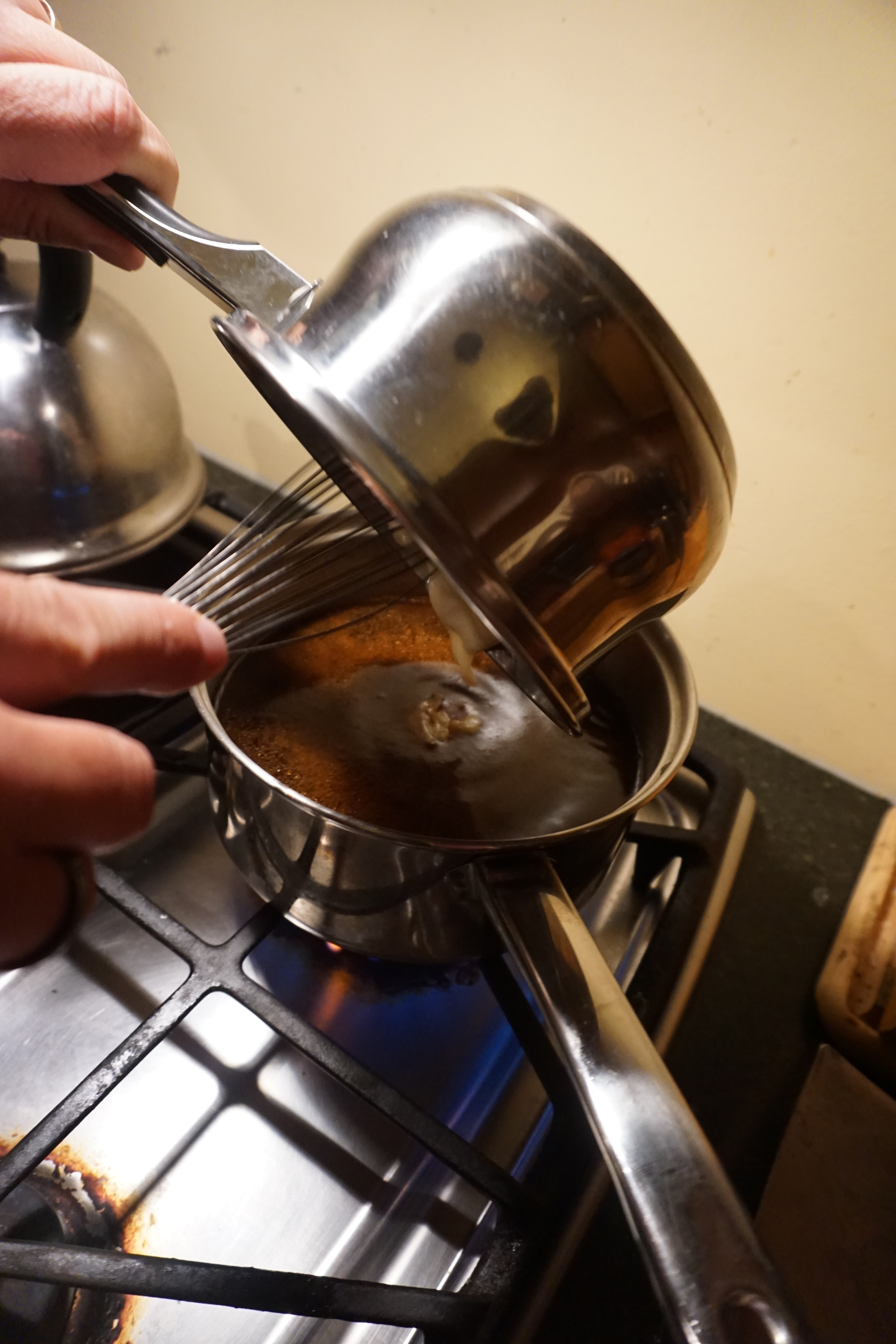 Strain the liquid from the vegetables into a saucepan and add 2 tablespoons of Gravy Master