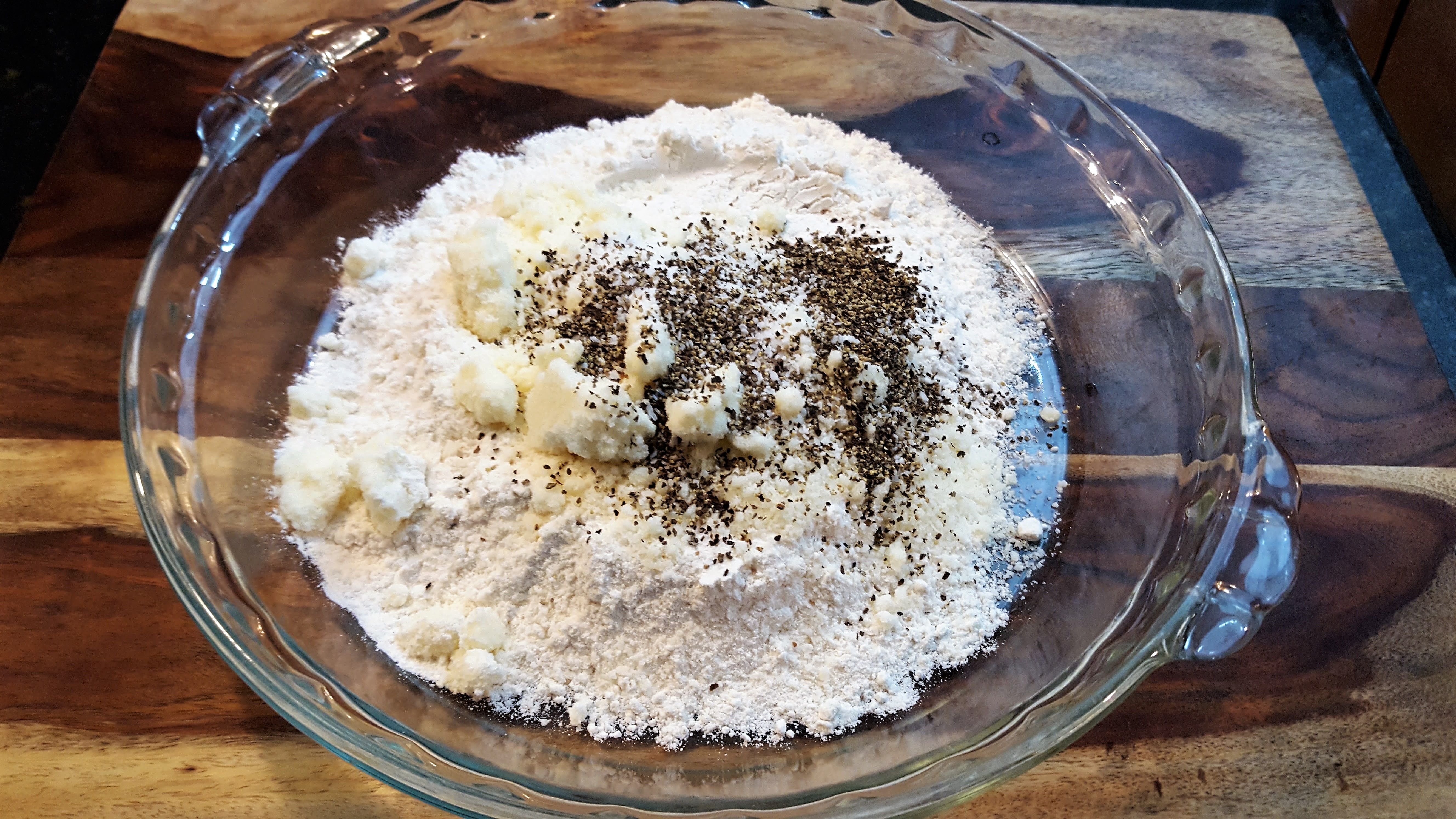 In a pie plate, combine 1 cup of flour, 1/2 cup of grated Romano or Parmesan cheese, 1 teaspoon each of kosher salt and ground black pepper