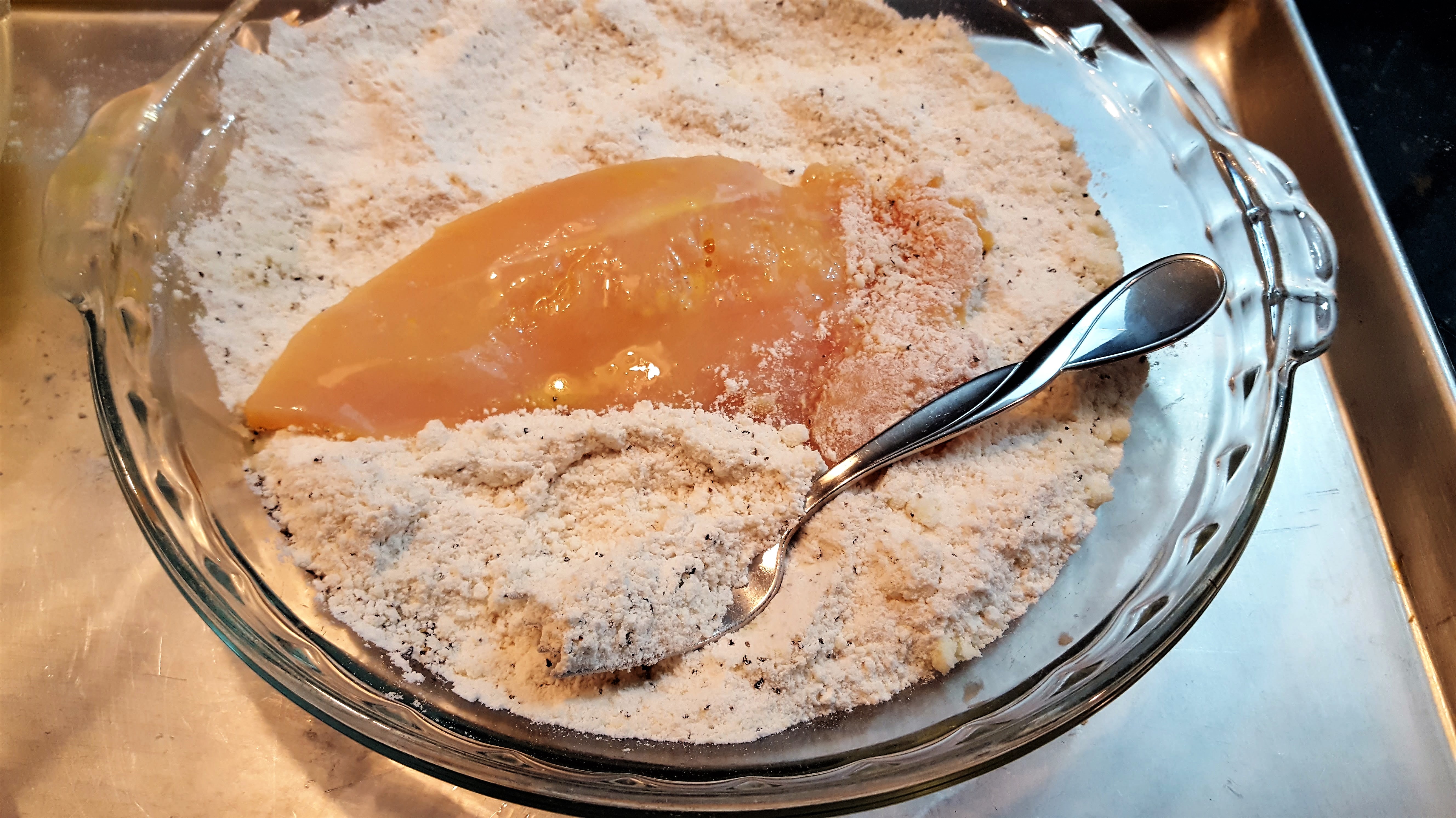 I don’t like the chicken to sit too long coated in the flour as it gets kind of gummy