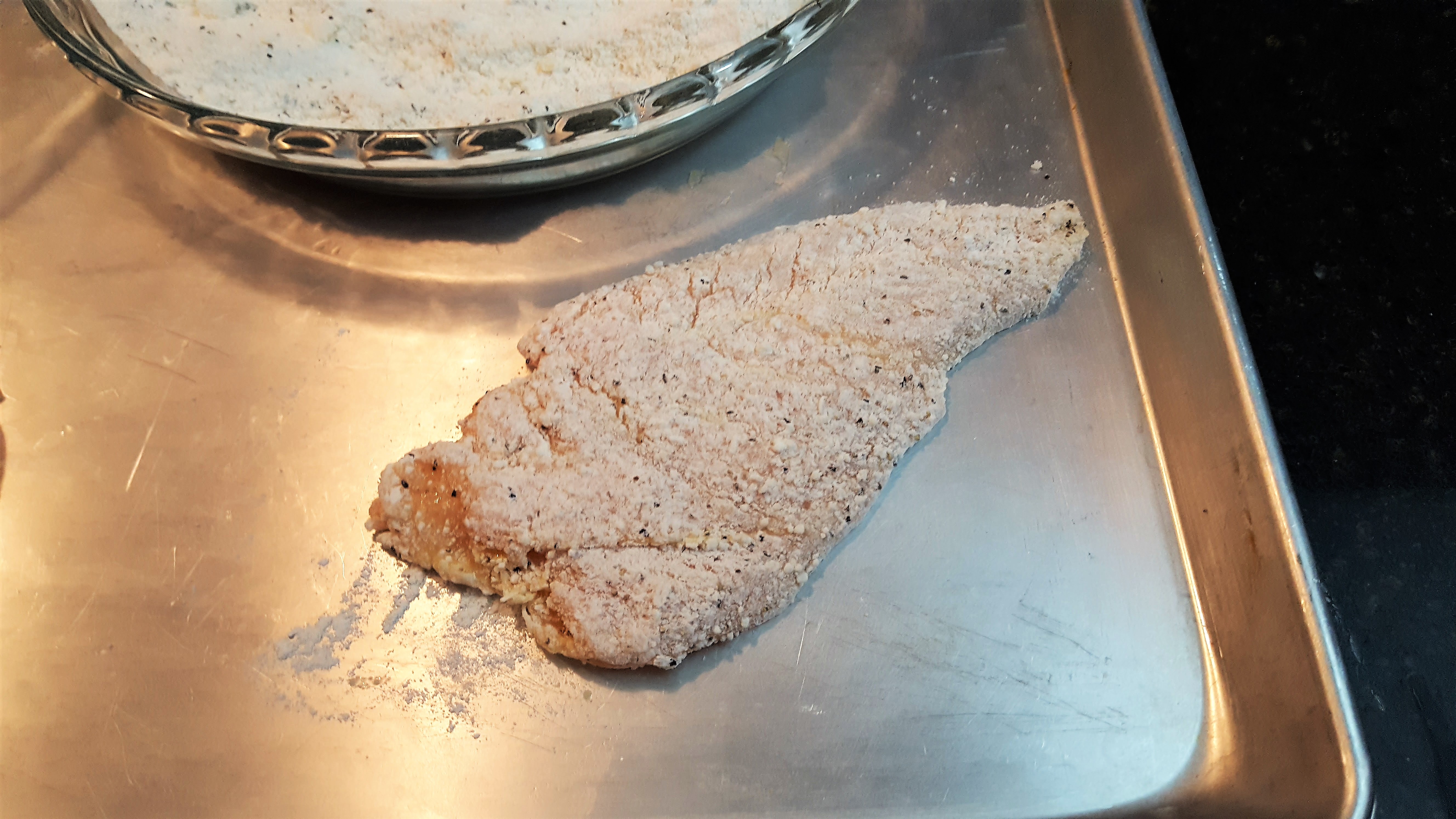We like to use a large sheet pan as a dredging station