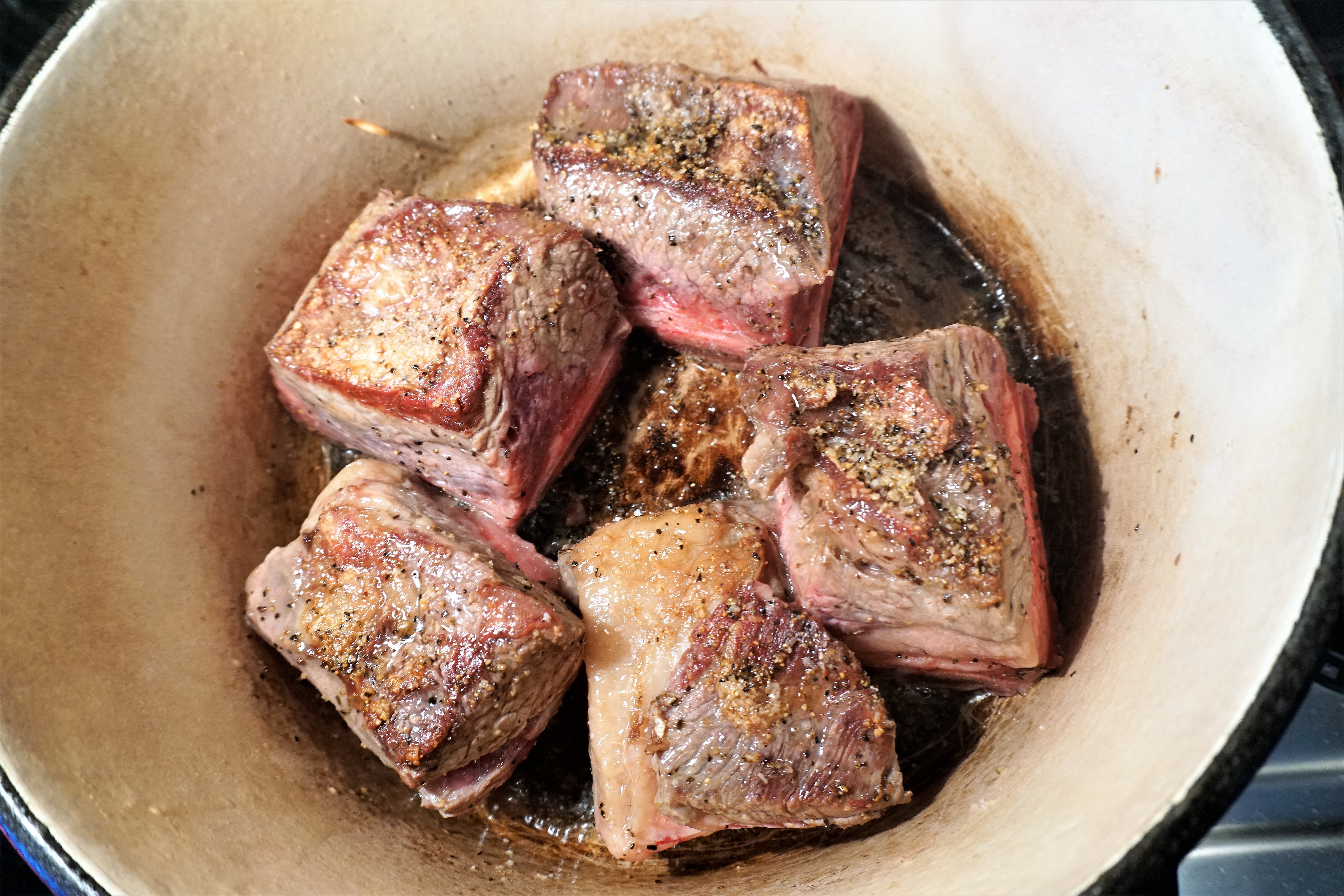 Here I have 5 beef short ribs that I have seasoned with some kosher salt and ground black pepper