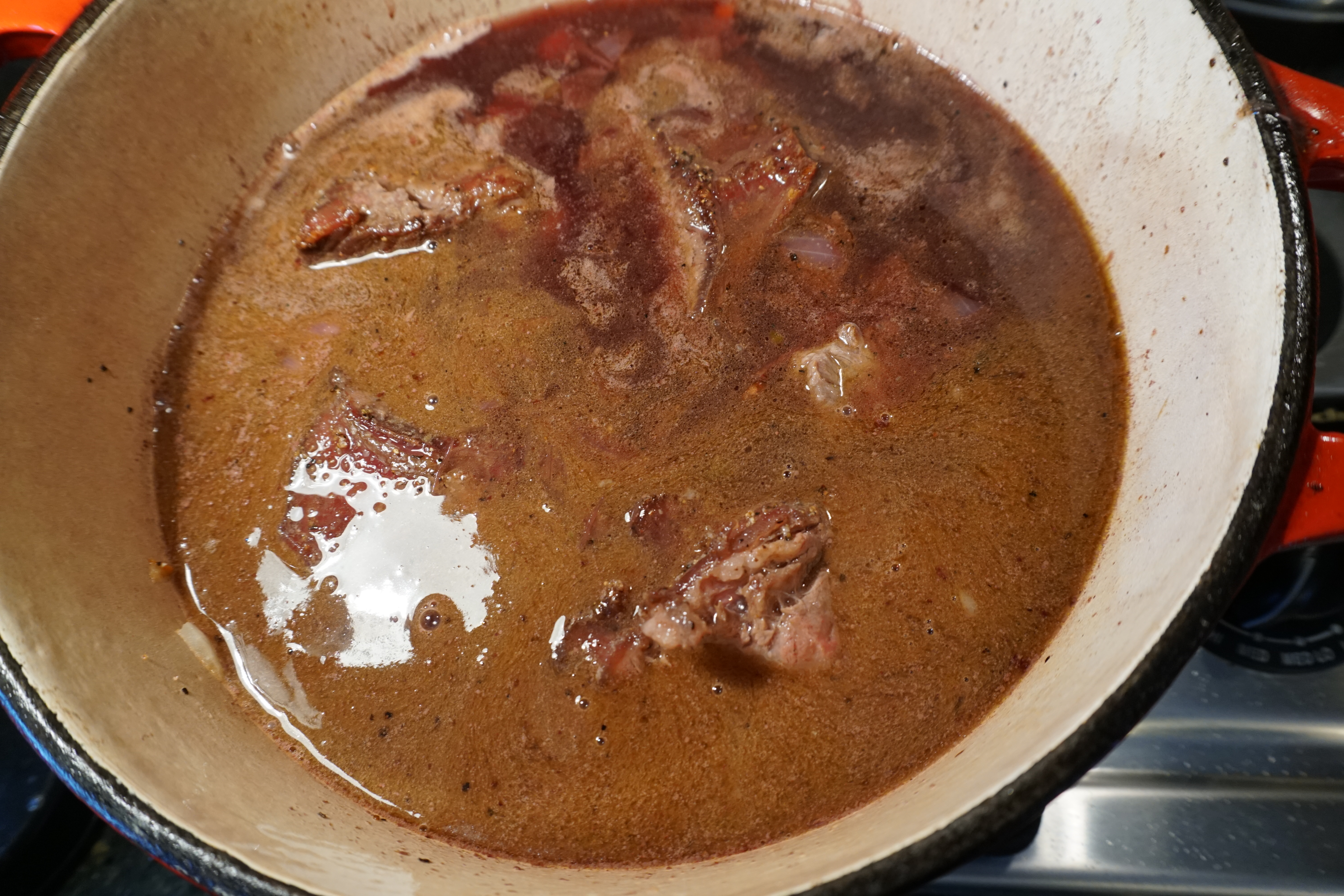 Pour in 2 cups of chicken stock and bring this to a boil. Turn the heat off and add your ribs back in making sure they are mostly covered with liquid. Place the covered pot in the oven and let cook for 2-2 1/2 hours or until the meat falls right off the bone when tested with a fork